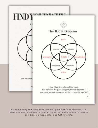 Guidance, journaling prompts, Ikigai exercises, reflections, and affirmations.