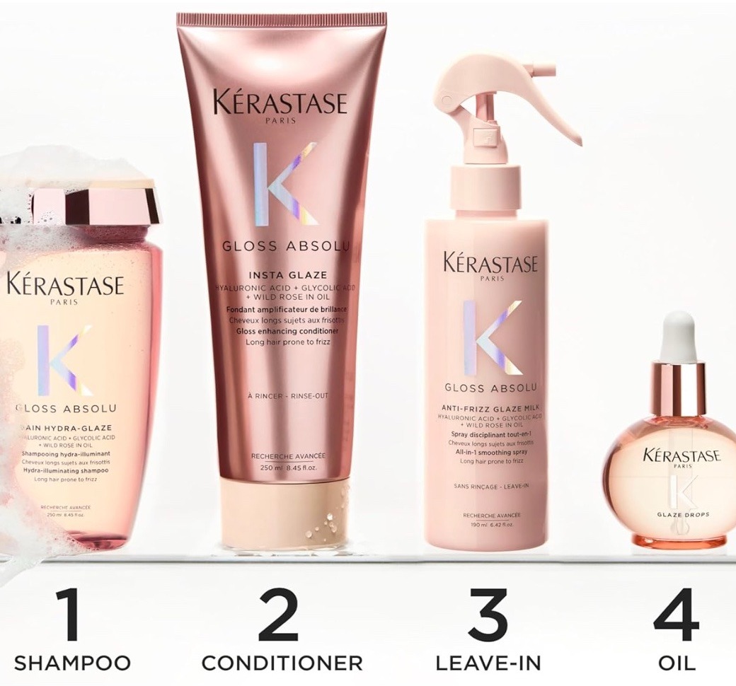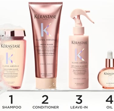 Det första steget till glansigt hår börjar i duschen. Kérastase Gloss Absolu Bain Hydra-Glaze Shampoo (250 ml) rengör skonsamt samtidigt som det tillför intensiv fukt. Formulan innehåller glykolsyra som hjälper till att släta ut hårfibern och ta bort produktrester, samt hyaluronsyra som binder fukt och ger håret en hälsosam glans.